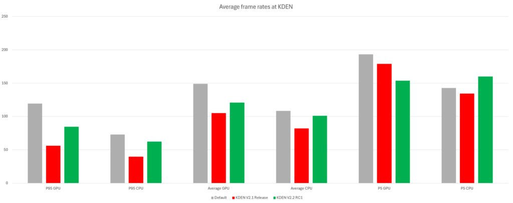 Das Update KDEN V2.2 bringt massive Leistungsverbesserungen (37 % mehr FPS), visuelle Upgrades mit hochauflösenden Texturen, FAA-konforme Markierungen und Schilder, sowie umfassende Überarbeitungen an Terminal- und Gebäude-Modellen, Innenbereichen und vielen Details auf dem gesamten Flughafen.