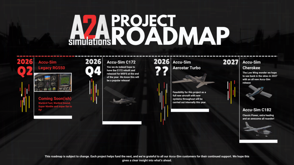 Neben den neuen Projekten betont A2A, dass auch bestehende Add-ons weiterhin aktiv weiterentwickelt werden. Dazu zählen unter anderem umfassende Überarbeitungen wie geplante G5-Retrofits für die Accu-Sim Comanche 250 und die Aerostar 600 sowie weitere Verbesserungen, die sich aktuell in Entwicklung befinden.