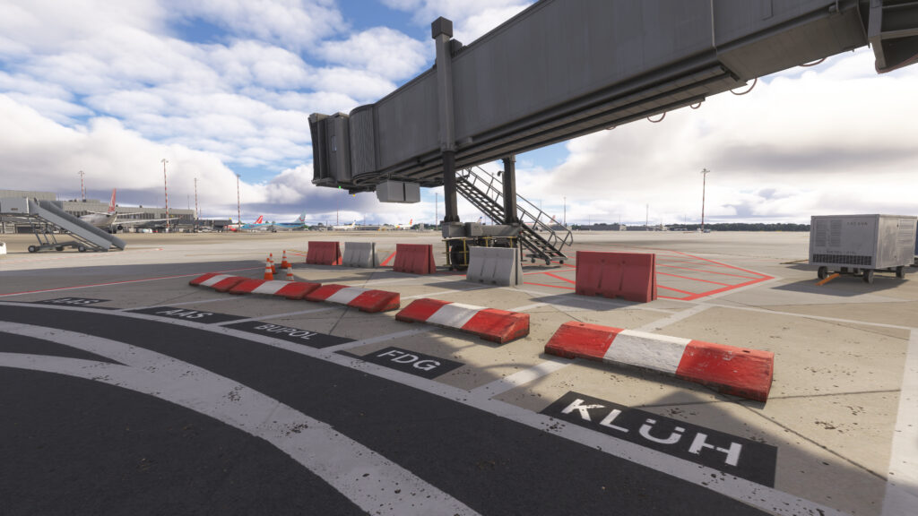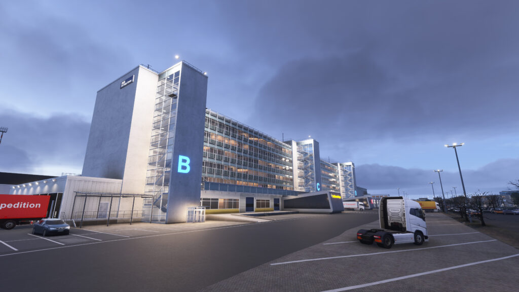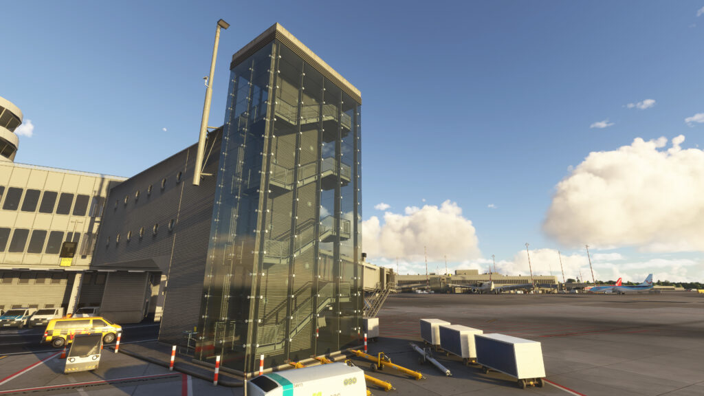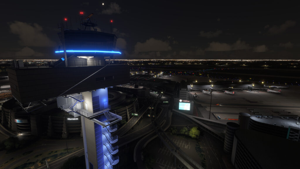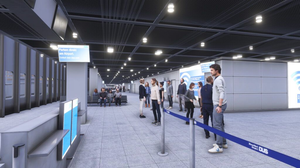 Dabei wurde nicht nur der Platz selbst umgesetzt, sondern auch die umliegenden Gebäude sind Teil der Szenerie und mit eigens gebauten 3D-Modellen ausgestattet. Darunter auch der Flughafenbahnhof, welcher sich direkt unter dem östlichen Ende der Hauptstart- und Landebahn des Platzes befindet. Und auch die markante Schwebebahn, welche Passagiere vom Bahnhof zum Terminal bringt, ist natürlich vorhanden und animiert in der Szenerie.