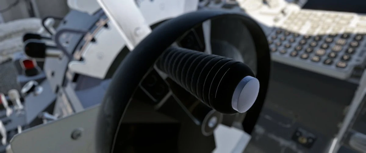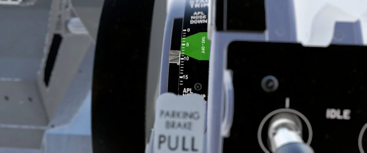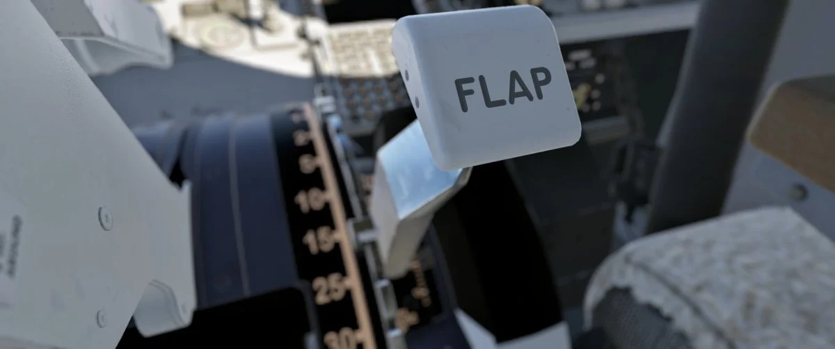 Klappenkonfiguration, Manueller Steuerung (z. B. beim Gegensteuern) und automatisierten Modi für Flaps „up“ und „down“ verändern. Die manuellen Trim Wheels bieten taktiles Feedback durch variablen Widerstand – bei hohen Geschwindigkeiten braucht man mehr Kraft zum Drehen, was durch die Trimmgeschwindigkeit simuliert wird.