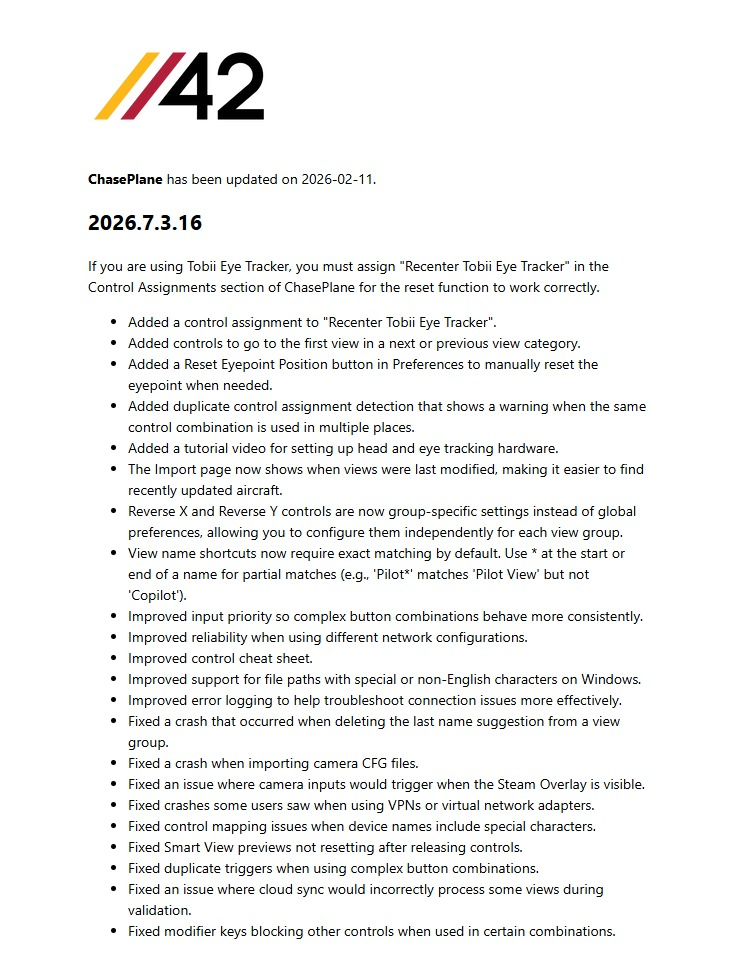 Parallel 42 hat ein umfangreiches Update für ChasePlane veröffentlicht. Die Version 2026.7.3.16 bringt zahlreiche Verbesserungen und Fehlerbehebungen mit sich, die vor allem die Stabilität und Benutzerfreundlichkeit im Microsoft Flight Simulator 2024 erhöhen sollen. Besonders Nutzer von Head- und Eye-Tracking-Hardware dürfen sich über gezielte Optimierungen freuen.