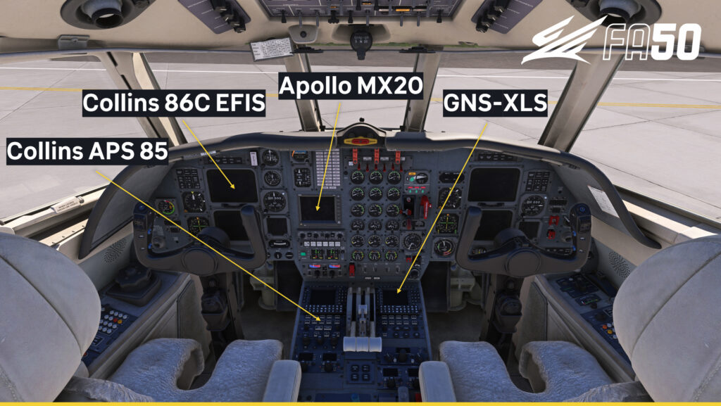 Besonderes Augenmerk legt Contrail auf die Systemtiefe: Geplant sind vollständig eigenentwickelte Avioniksysteme, darunter das GNS-XLS Flight Management System, das Apollo MX20 Multifunction Display, das Collins EFIS 86C sowie ein eigens entwickelter Autopilot basierend auf dem Collins APS 85. Damit orientiert sich die Simulation am klassischen FA50-Cockpit mit überwiegend analogen Instrumenten, ergänzt durch vereinzelte moderne Anzeigen.