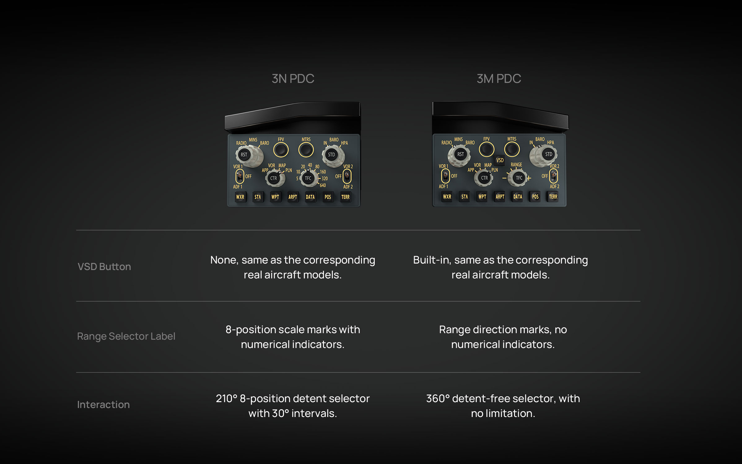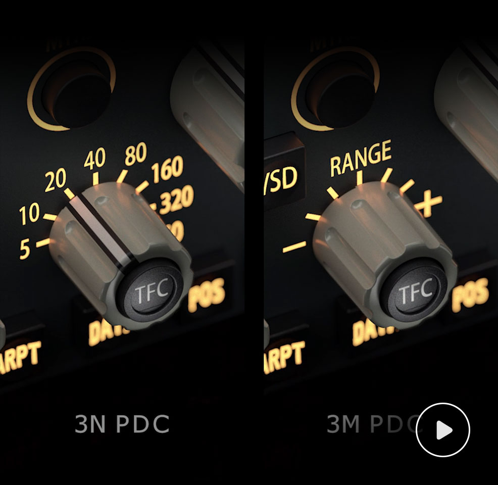 Das 3N- und 3M-PDC ist das EFIS-Panel der Boeing 737. Während die Version 3N die NG-Variante (Next Generation) repräsentiert, steht 3M folgerichtig für die MAX-Version. Doch nicht nur die Bezeichnung unterscheidet sich – auch das Panel selbst weist einige bemerkenswerte Unterschiede auf. So verfügt die 3M-Version beispielsweise über einen überarbeiteten Drehregler für die Range-Anzeige, der nun endlos gedreht werden kann. Außerdem wurde ein zusätzlicher VSD-Button (Vertical Situation Display) integriert, der in der NG-Version nicht vorhanden ist.