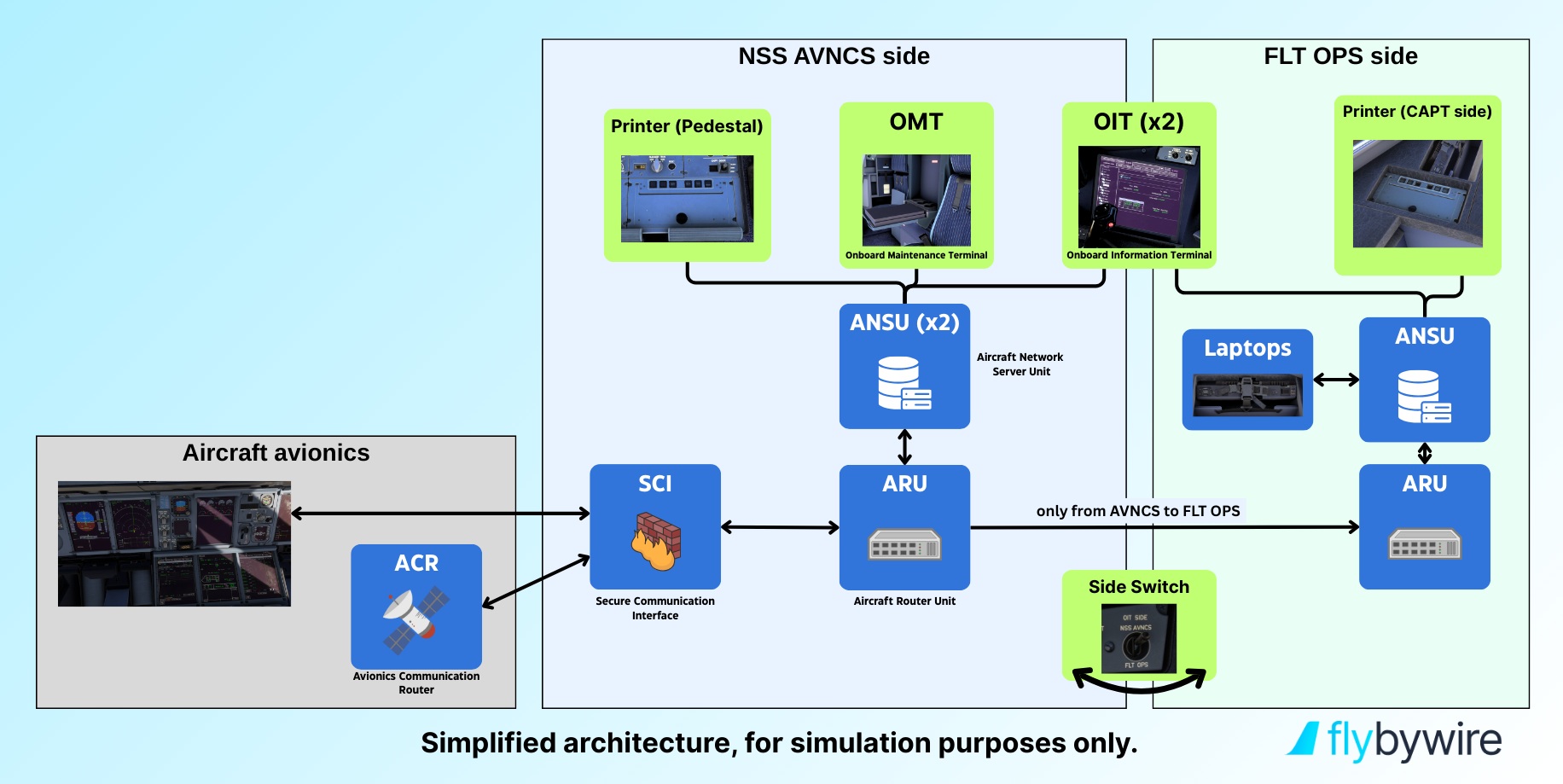 Die meisten Funktionen erfordern allerdings noch das Kommunikations-Backend (gemeinsam genutzt durch ATC COM und NSS AVNCS), das derzeit parallel entwickelt wird. Ein vereinfachtes Schema unterstützt beim Navigieren durch das OIS und die Flight Deck-Komponenten. Ziel ist – wie bei allen Systemen – eine möglichst realitätsgetreue Abbildung der Architektur und Kommunikationsmuster, um sowohl normales als auch abnormales Verhalten authentisch darstellen zu können.
