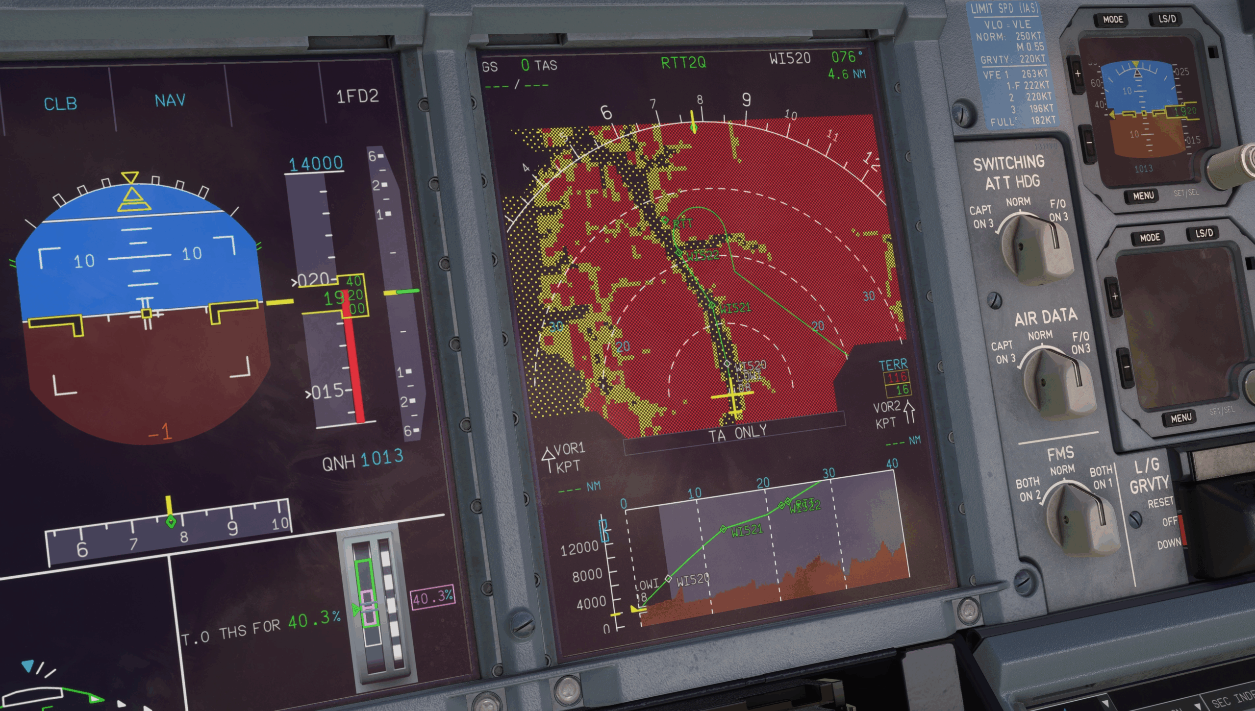 Das „Vertical Display“ (VD) wurde z.B. im Monat Mai hinzugefügt und war ein Feature welches bis dato gefehlt hat. Ihr könnt nun also den Flugweg auch dreidimensional sehen und zwar samt der Constraints und entsprechender vertikaler prediction modi. Außerdem wird der Terrain korrekt entlang der Route dargestellt und im VD angezeigt. In dem Beispiel von FBW wurde hier LOWI angeführt, welches zwar kein klassisches A380 Ziel ist aber gut zeigt, dass obgleich der hohen Berge, die Departure problemlos geflogen werden kann.