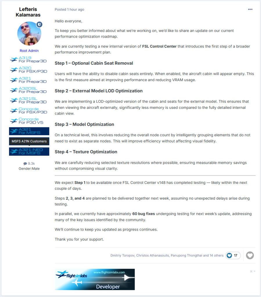 Der Grund für dieses Update liegt in der enormen Komplexität der Simulation. Während FSLabs für eine der tiefgreifendsten Systemtiefen am Markt bekannt ist, reizt das Addon die Hardware-Ressourcen des Simulators extrem aus. Besonders die hochdetaillierte Kabine hat sich als Ressourcenfresser erwiesen. Da moderne Simulatoren wie der MSFS sehr empfindlich auf eine Sättigung des Grafikspeichers reagieren, führen volle Speicher schnell zu spürbaren Performance-Einbrüchen. Lefteris Kalamaras, Kopf hinter FSLabs, räumte ein, dass hier Optimierungsbedarf besteht, um das Flugzeug für eine breitere Nutzerbasis flüssig fliegbar zu machen, ohne dabei die visuelle Qualität für High-End-Systeme opfern zu müssen.