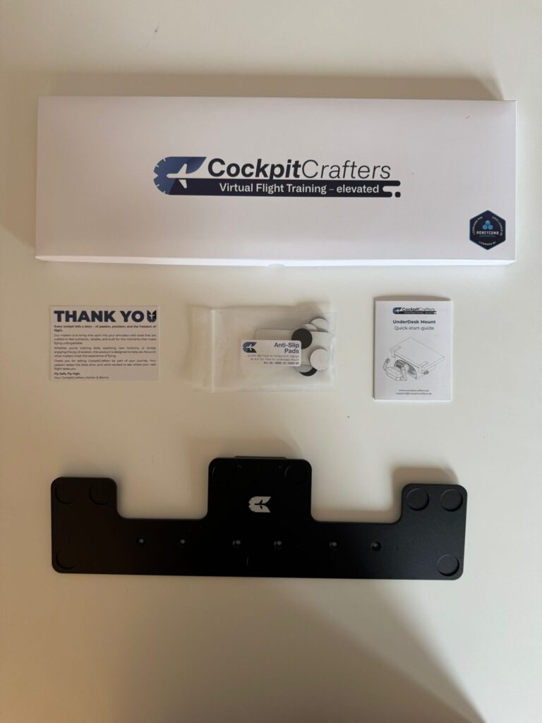 Sobald man den weißen Karton mit dem CockpitCrafters-Logo öffnet, wird man direkt von der Halterung, einer kleinen Anleitung und einem freundlichen Dankesschreiben begrüßt. Räumt man diese beiseite, fällt der Blick sofort auf das Herzstück – die eigentliche Halterung aus Metall.