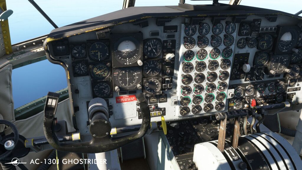Beim Blick in das virtuelle Cockpit fällt sofort ein Detail auf, das in der Community für Diskussionen sorgen dürfte: Während die echte AC-130J als modernste Variante der Hercules-Familie eigentlich über ein digitales Glass-Cockpit verfügt, hat Captain Sim hier das klassische „Steam-Gauge“-Layout mit analogen Instrumenten verbaut. Das entspricht zwar nicht der realen Avionik-Ausstattung der Ghostrider-Serie, bietet aber für Fans der klassischen Fliegerei die gewohnte C-130-Umgebung, die man bereits aus früheren Veröffentlichungen des Entwicklers kennt.