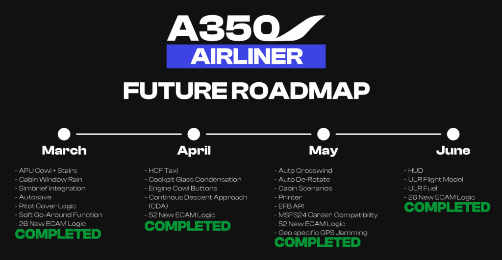 Nach der Veröffentlichung des A350 Airliner für den MSFS 2024 und zuletzt auch für Xbox, sieht sich das Team mit der Version 1.1.2 auf einem stabilen Stand. Wesentliche Neuerungen wie ein funktionsfähiges, collimiertes Head-Up Display (HUD), realitätsnahe Anpassungen an Hydraulik- und Klappensystemen sowie verbesserte Animationen und Texturen wurden implementiert. Zudem wurde die Systemtiefe durch Optimierungen an FADEC, CPDLC, FMS und Sounddesign erhöht.