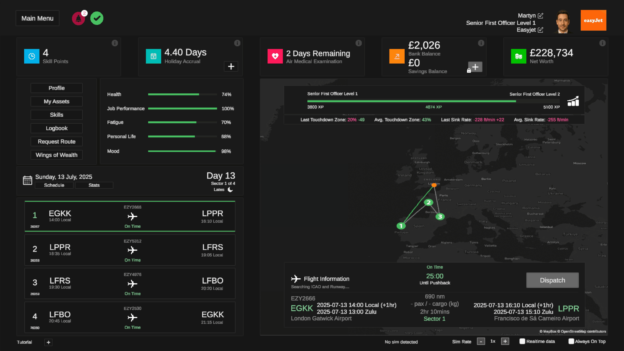 Just Flight veröffentlichen nicht nur Flugzeuge als Add-Ons sondern auch diverse Tools drumherum. Der neueste Spross dieser Tools ist „Fly the Line Short Haul Edition“, ein Karrieretool für MSFS,P3D,FSX und X-Plane. Im Wesentlichen könnt ihr hier entweder eine klassische Karriere starten, einen freien Spielmodus verfolgen bei dem Geld keine Rolle mehr spielt oder euch in einem „Shedule Mode“ Flüge und Shedules generieren lassen. Innerhalb der Karriere müsst ihr euch hier neben den reinen Fliegen ebenfalls um euch selbst kümmern. Egal ob Ernährung, Schlaf, Medical, Umgebung, alles soll eine Rolle spielen und wichtig sein. Cargo und Langstreckenflüge sind jedoch tabu. Ähnlich wie bereits aus anderen Tools bekannt, könnt ihr hier ebenfalls Wochenflugpläne erstellen lassen, diese abfliegen und mit Simbrief planen. Allerdings ist es, wie der Name ja schon verrät, eine Version für Kurz- bzw. Mittelstreckenflüge. Ob es darüber hinaus noch Updates für Fracht- und Langstreckenflüge gibt lässt Just Flight an der Stelle offen. Erwerben könnt ihr eure neue Karrierechance direkt auf der Website von Just Flight für 29,99€.