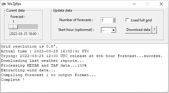 Die Daten werden verarbeitet und in ein Format gebracht, das PFPX versteht – als wäre es ein Export aus Active Sky. Der Nutzer kann dabei festlegen, wie viele Stunden in die Zukunft die Prognose reichen soll und ob ein optimiertes Stationsnetz oder ein vollständiges Gitter geladen wird.