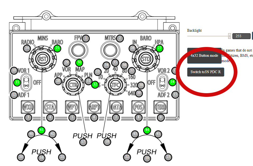 Die Pushbuttons für z.B. Airports, WXR usw. fühlen sich ein wenig wie kleinere Versionen der MCDU/FMC Buttons an. Mit einem festen Druck lösen die unter dem Gummi liegenden Schalter immer einwandfrei aus. Der VSD und die zwei Knöpfe zum Darstellen der Höhe in Metern und des FPV sind ebenfalls gummiert.