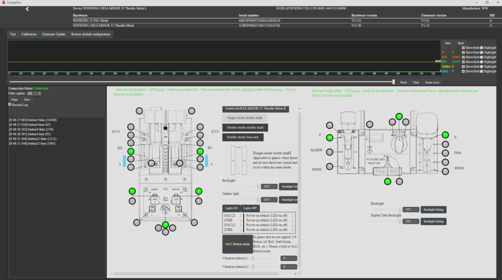 Nach dem umfangreichen Befühlen der Hardware außerhalb des Simulators soll es jetzt an die ersten Testflüge gehen. Vor diesem steht aber erst einmal das Setup des Throttle mit der SimAppPro von WinWing. Der Throttle wird dort anstandlos erkannt und auch die ersten Firmware-Updates stehen direkt zur Verfügung und können problemlos installiert werden. Der zweite Blick in die App offenbart dann jedoch gleich den wohl kontroversesten Punkt an der Hardware. Denn WinWing hat mit dem Throttle eine Hardware erschaffen zu haben, welche mit jedem Flugzeug Add-On dieser Welt funktionieren soll. Was an sich löblich ist, wird jedoch schnell zum Bumerang im Betrieb. Denn die Achsen des Throttles haben drei verschiedene Betriebsmodi: