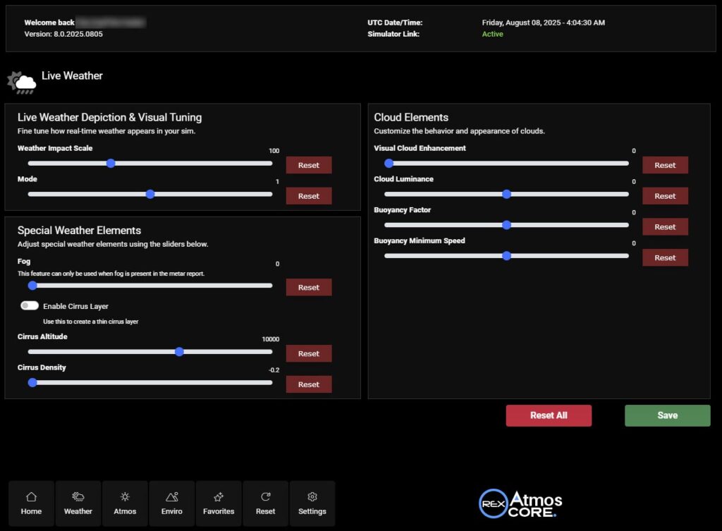 Die Benutzeroberfläche ist modular aufgebaut und gliedert sich laut Mitteilung in separate Bereiche für Weather, Atmosphere und Enviro. Nutzer können demnach Live-Wetter in Echtzeit verändern oder eigene Wetterszenarien erstellen. Für Anwender, die wiederkehrende Einstellungen nutzen, bietet das System ein Preset-Management mit Cloud-Backup: Einstellungen lassen sich speichern, teilen und automatisch laden. REXSimulations kündigt zudem eine bevorstehende Integration mit dem eigenen Dienst REX Weather CORE an, die automatische und dynamische Anpassungen während des Fluges ermöglichen soll.