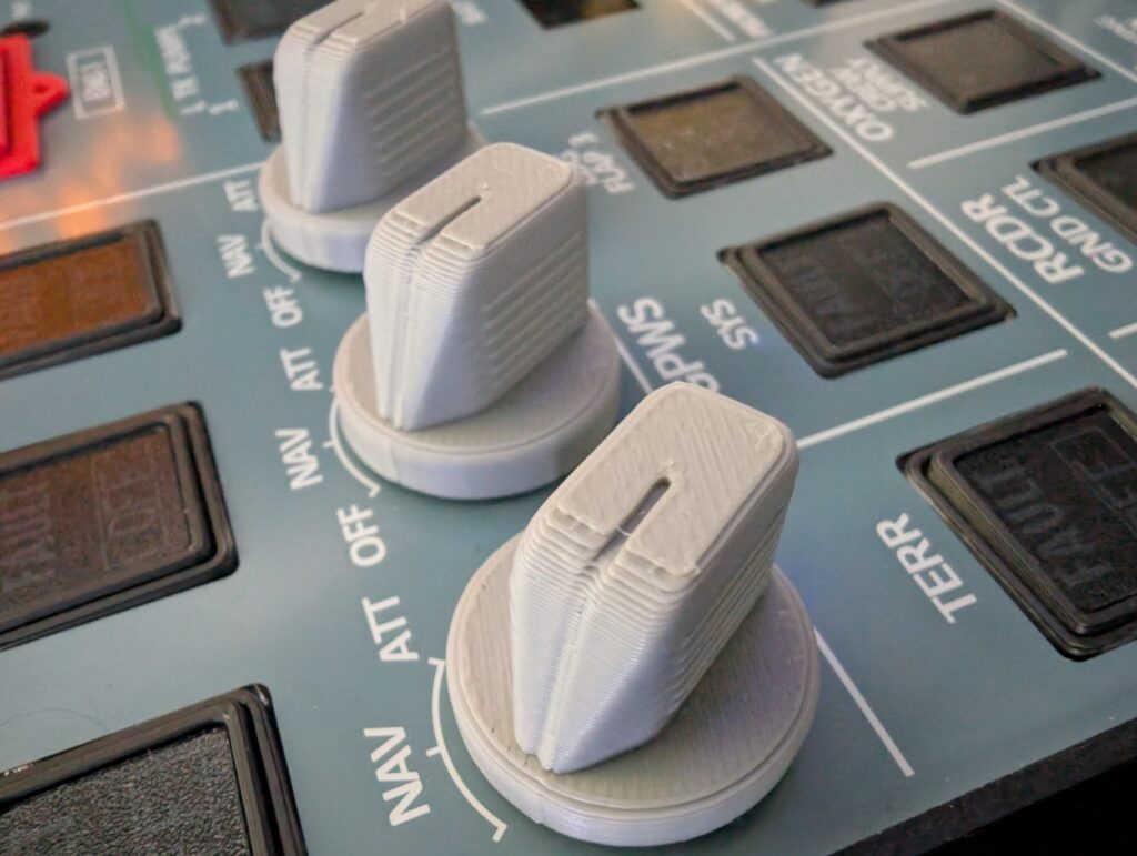 Die Drehknöpfe für Wiper, X-Bleed und IRS bieten eine sehr überzeugende taktile Rückmeldung und lassen sich präzise bedienen. Auch im täglichen Einsatz fühlen sie sich hochwertig an. Bei genauer Betrachtung ist jedoch erkennbar, dass die Knöpfe 3D-gedruckt sind, da die typische Schichtstruktur sichtbar bleibt – ebenso beim OVHD-INTEG-LT-Knopf. Dies beeinträchtigt die Funktionalität jedoch nicht.