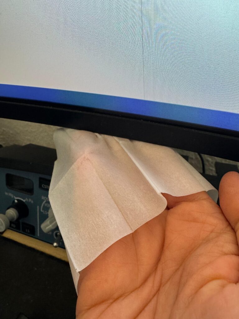Ist die Halterung am Tracker angebracht, geht es an die Montage am Monitor. Am besten reinigt man zunächst die Unterseite des Monitors gründlich mit dem mitgelieferten Alkoholtuch. So verschwinden Fette und Staubpartikel, und die Klebefläche der Halterung haftet später optimal.