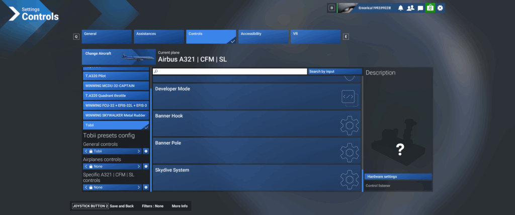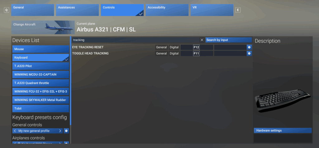 Trotzdem gibt es eine kleine, aber wichtige Einstellung, die ihr unabhängig vom Simulator vornehmen solltet. Sobald ihr euch ins Flugzeug gesetzt habt, müsst ihr die Tasten für das Zurücksetzen des Eye Trackers sowie für das Aktivieren oder Deaktivieren des Trackers konfigurieren.