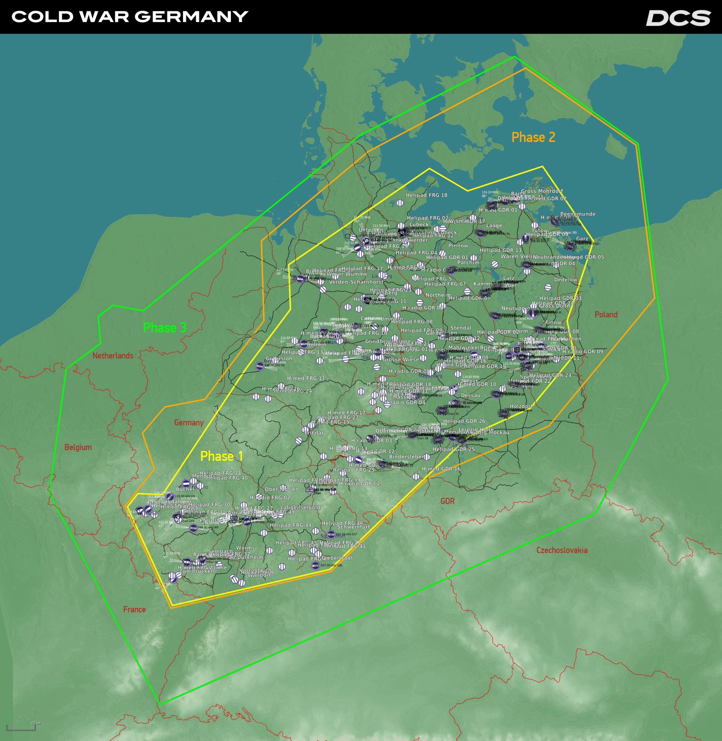 Das Kartenareal umfasst rund 980 x 800 Kilometer und deckt weite Teile West- und Ostdeutschlands ab. Jede Phase erweitert das Territorium um weitere Städte, Flugplätze, Infrastrukturen und landschaftliche Details. Bereits mit Phase 1 werden zahlreiche militärische und zivile Flugplätze integriert – darunter bekannte Namen wie Bitburg, Frankfurt, Hahn, Rammstein, Tegel, Tempelhof, sowie ostdeutsche Basen wie Laage, Finow oder Neubrandenburg. Ergänzt wird das Ganze durch spezialisierte Flugfelder für Hubschrauber und Leichtflugzeuge.