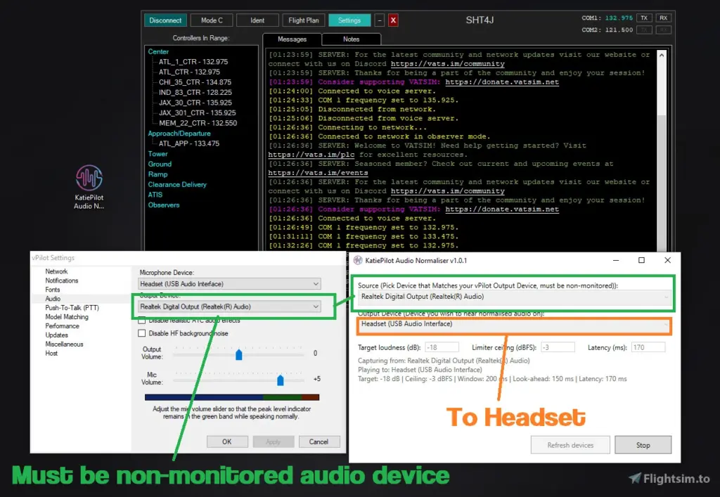 Der KatiePilot Audio Normaliser wird laut der Beschreibung einfach auf dem Rechner installiert und schaltet sich über eine Windows-Funktion zwischen die Ausgabe des vPilot/xPilot und das was ihr hört. Für die Funktion müsst ihr dann nur im Piloten-Client und dem Tool die korrekten Audiogeräte einstellen und ein paar Parameter setzen, alles weitere soll voll automatisch im Hintergrund geschehen. Eine Einrichtung von virtuellen Soundkarten oder speziellen Treiber ist nicht notwendig.