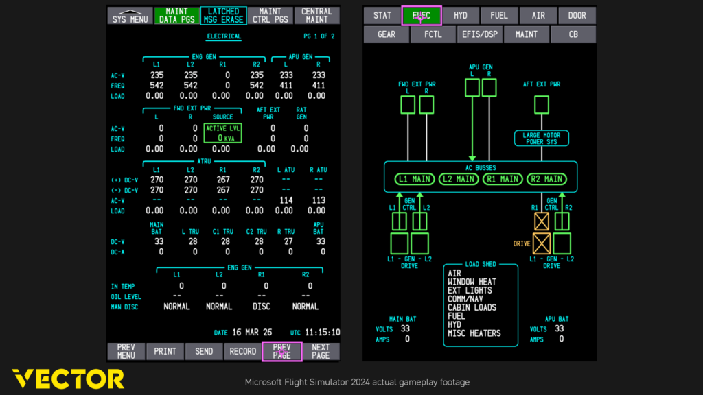 Im zweiten Teil der Präsentation drehte sich dann alles um die inneren Werte des Vector Dreamliner. Laut Ellie möchte sie hier nicht den Begriff Study Level verwenden, da dieser wenig greifbar und überstrapaziert sei. Stattdessen nennt sie das Ziel mit dem Flugzeug ein „Schematic Level“ zu erreichen. Dies bedeutet, dass das Flugzeug Schematiken, welche Wartungspersonal zur Verfügung stehen, vollständig abbildet. Dies gilt auch aus der Perspektive eines Piloten. Hier soll das FCOM und die weiteren Trainingsunterlagen eins zu eins auf das virtuelle Pendant anwendbar sein. So stehen bereits jetzt über 700 verschiedene ECAM Seiten simuliert sein.